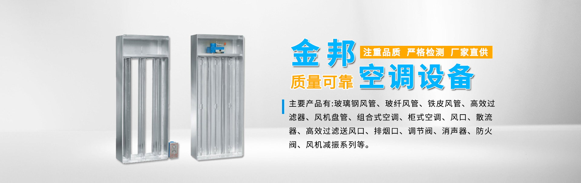 江蘇金邦空調(diào)設(shè)備制造有限公司專(zhuān)業(yè)生產(chǎn)玻璃鋼風(fēng)管、玻纖風(fēng)管、鐵皮風(fēng)管、高效過(guò)濾器、風(fēng)機(jī)盤(pán)管、組合式空調(diào)、柜式空調(diào)、風(fēng)口、散流器、高效過(guò)濾送風(fēng)口、排煙口、調(diào)節(jié)閥、消聲器、防火閥、風(fēng)機(jī)減振系列等產(chǎn)品